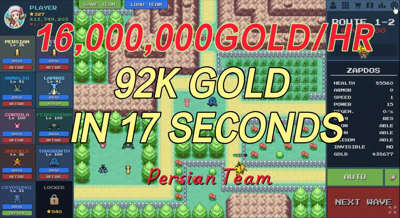 In this guide, we will break down the "Infinite Boss Loop" strategy. By farming the Wave 100 Boss (Zapdos) on Route 1-2, you can generate over 16 Million Gold per hour.